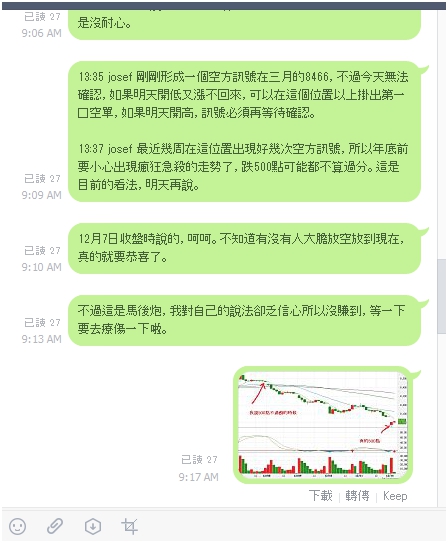 - 最後一筆交易小台三口,終於賠錢了,小賠兩點出場,其實可以多等一下就是賺的,但是因為進場過早,所以承擔一陣子帳面虧損壓力,卻在即將轉賠為賺的時候失去耐心,這是需要檢討的,對於出場的時機拿捏仍然需要再研究。